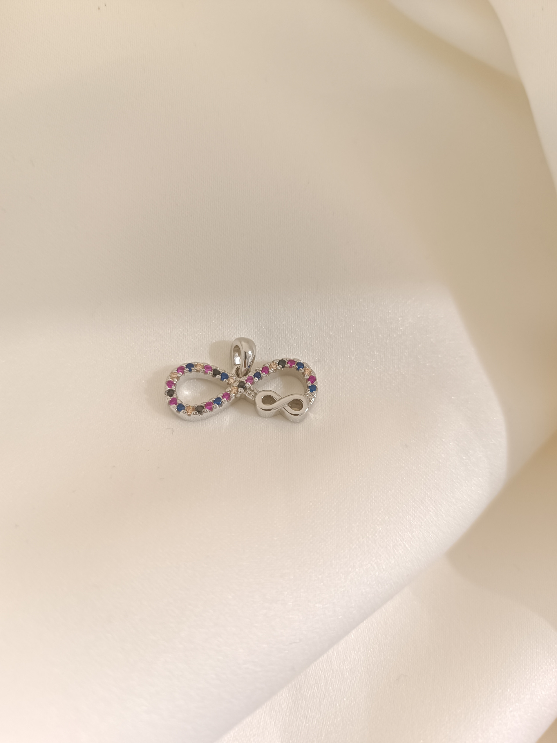 Sonstiges: Anhänger in Form eines Unendlichkeitszeichens, verziert mit Zirkonen in verschiedenen Farben und einem kleinen glänzenden Unendlichkeitszeichen. Größe 1 cm x 2 cm. Angewandter doppelter Oxidationsschutz (Rhodium).