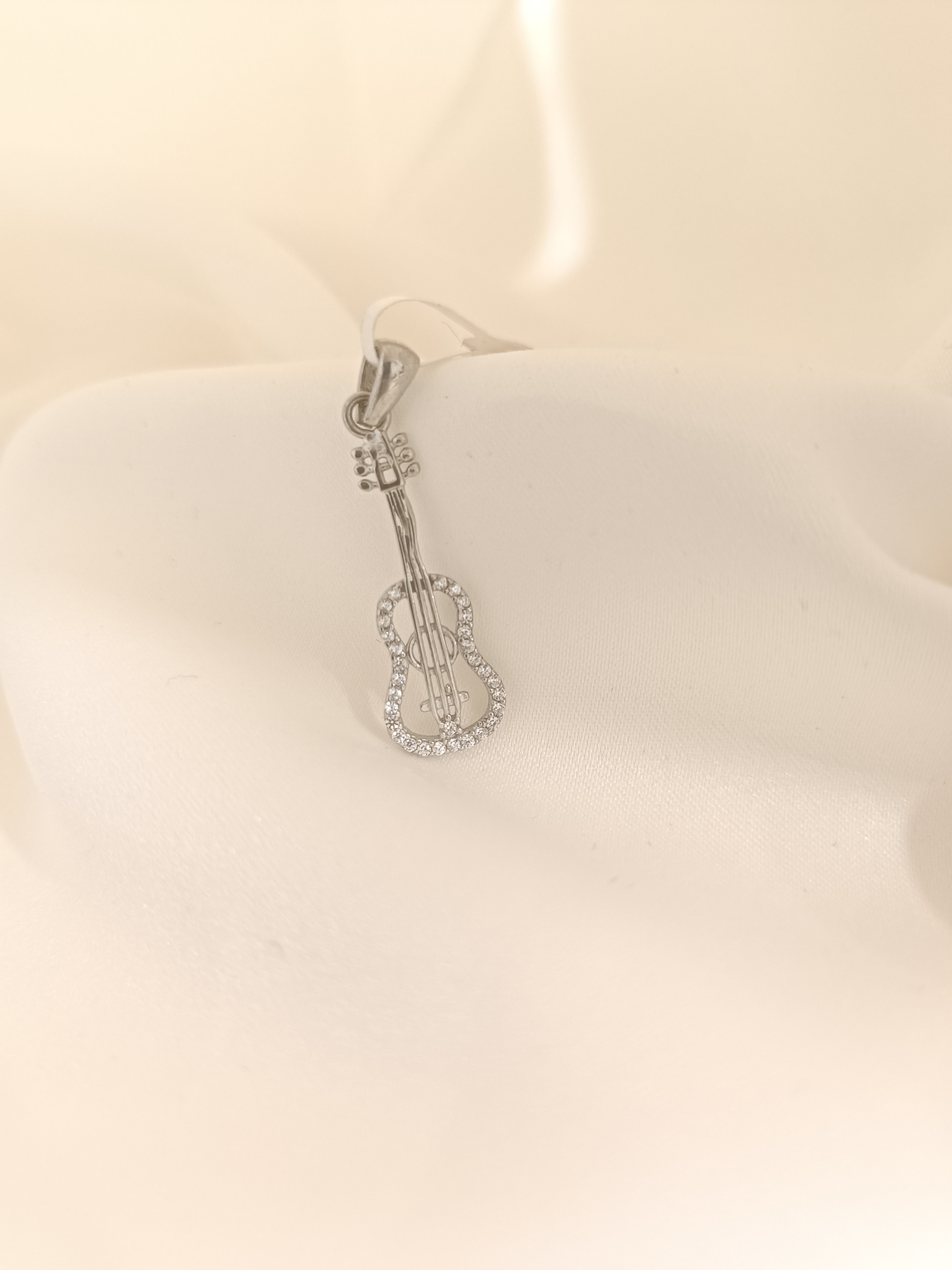 Sonstiges: Anhänger in Form einer Gitarre, verziert mit Zirkonen. Länge 3 cm. Angewandter doppelter Oxidationsschutz (Rhodium).