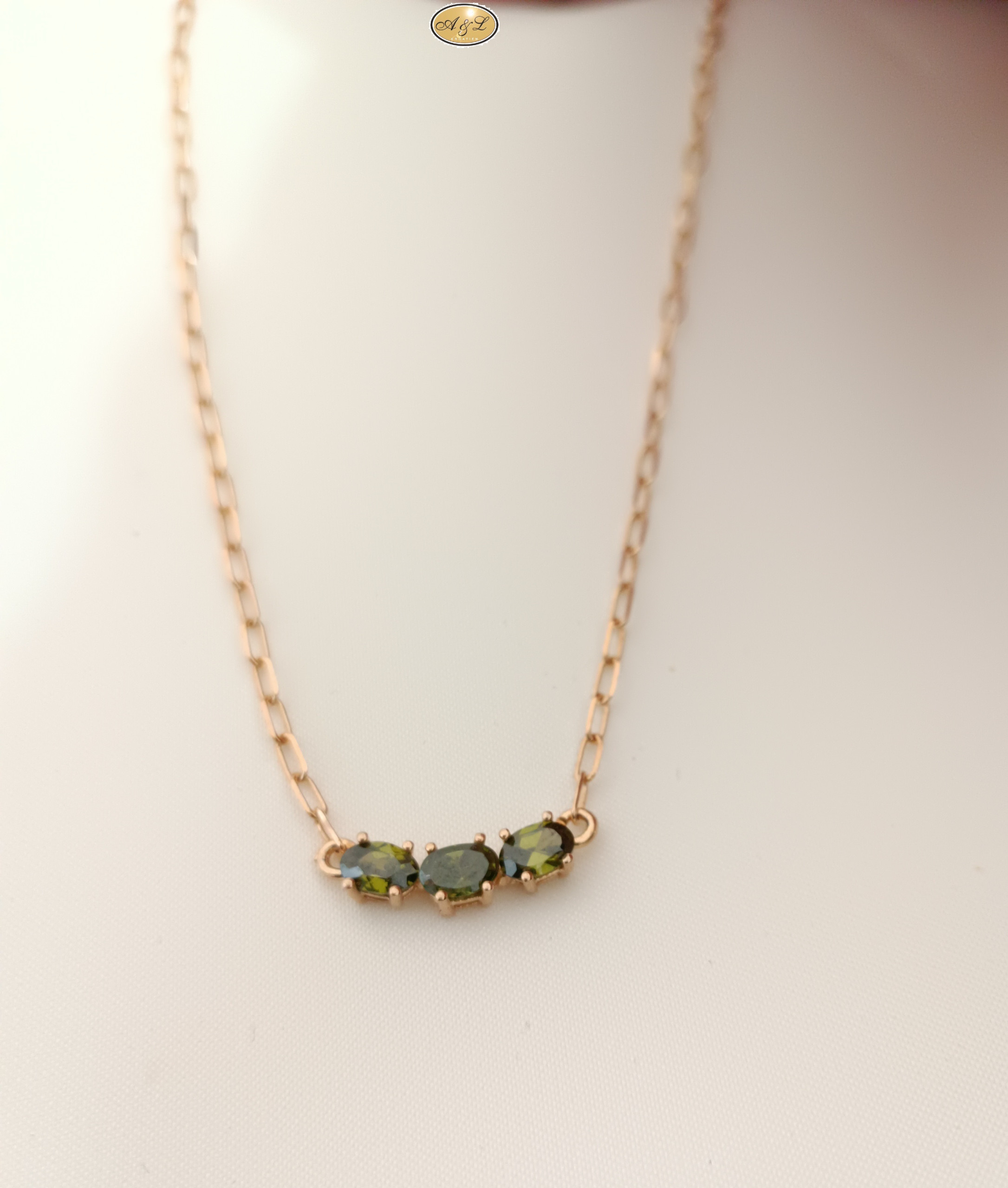Sonstiges: Angewandter doppelter Oxidationsschutz (Rhodium). Elegante Halskette mit 3 Stück olivgrünen Zirkonen, Durchmesser 5,5 mm x 4,5 mm. Gelbe Vergoldung.