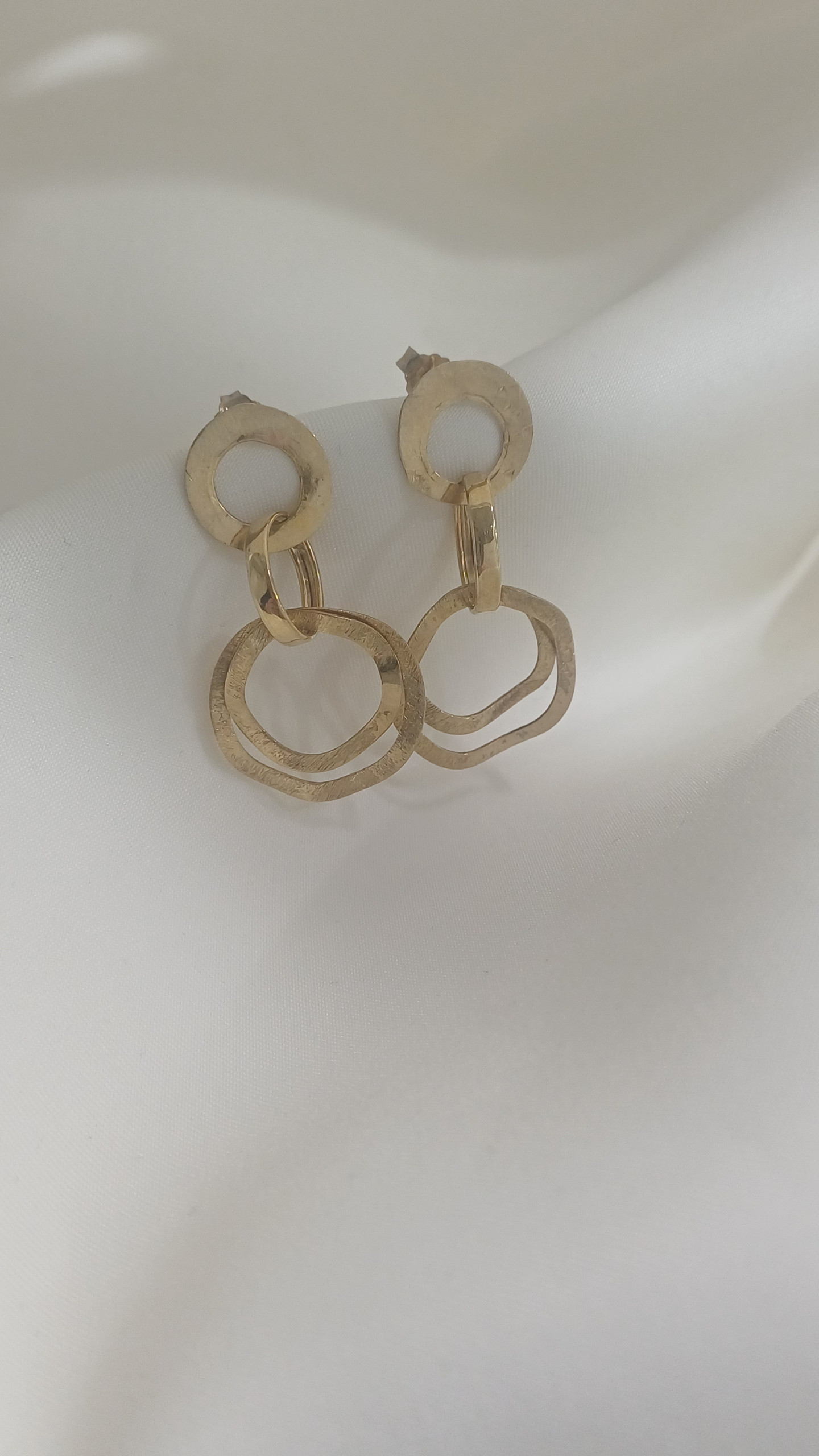 Sonstiges: Doppelt oxidationsgeschützt (gelbes Rhodium). Interessantes Design, hängend, mit kleineren und größeren unregelmäßigen Kreisen. Gesamtlänge 4,2 cm. Nadelverschluss. Handgefertigt.
