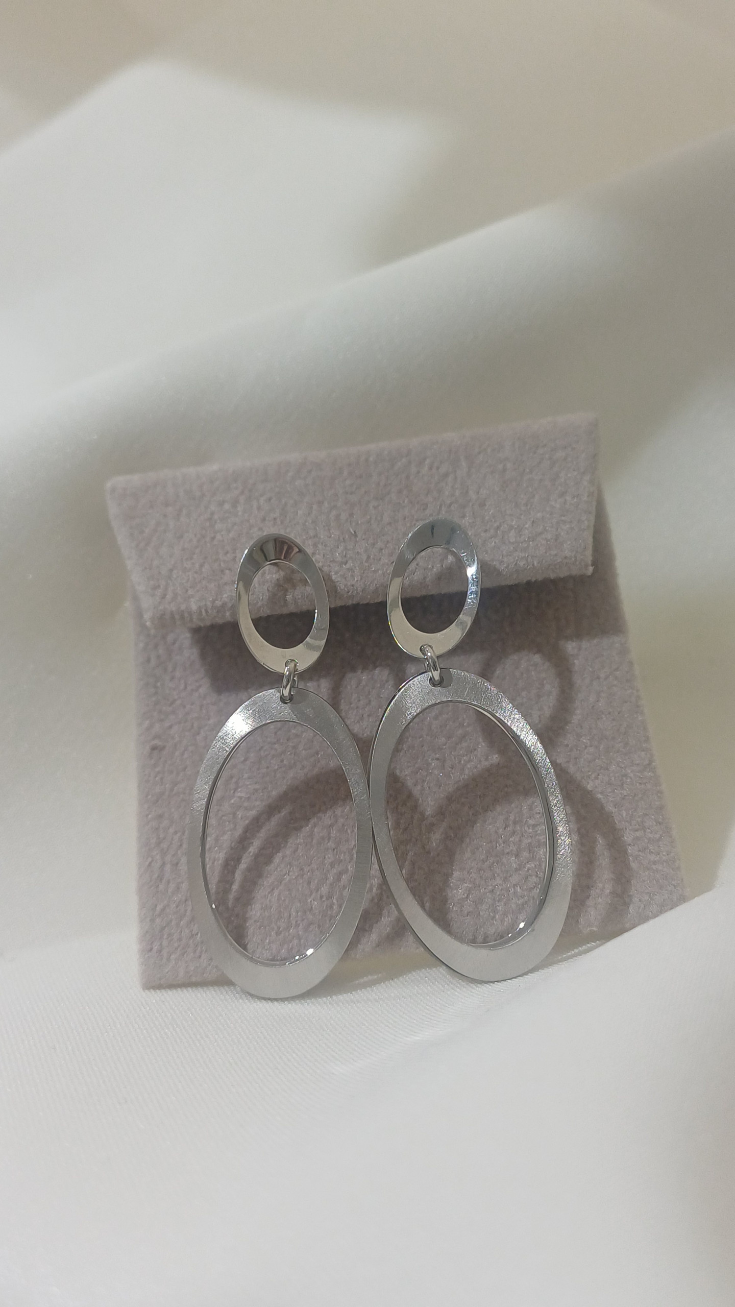 Sonstiges: Doppelt rhodiniert und somit oxidationsbeständig. Interessantes Design mit hängenden, kleineren, glänzenden und größeren, matten Ovalen. Gesamtlänge 4,2 cm. Nadelverschluss. Handgefertigt.