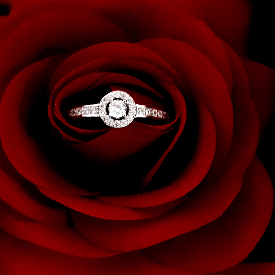 Sonstiges: Angewandter Doppeloxidationsschutz (Rhodium). Zentralzirkon mit einem Durchmesser von 3 mm und umgebenden kleineren Zirkonen.
