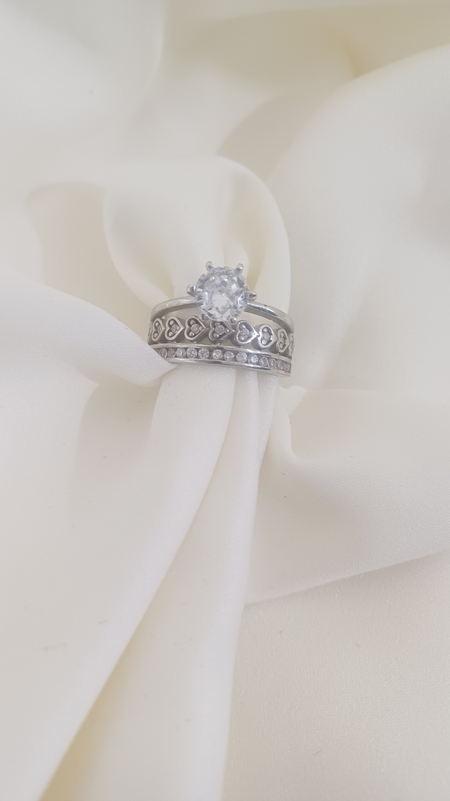 Sonstiges: Mit einem Zirkonia mit 7 mm Durchmesser und zwei weiteren Reihen kleinerer Zirkonia bis zur Hälfte des Rings. Aufgetragener doppelter Schutz gegen Oxidation (Rhodium).