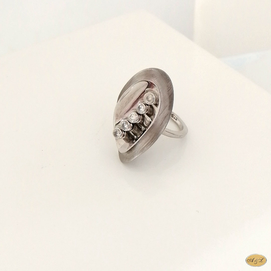 Sonstiges: Ovale Form mit matten und glänzenden Teilen, verziert mit 5 Zirkonen, 3 cm Durchmesser. Angewandter Doppeloxidationsschutz (Rhodium).