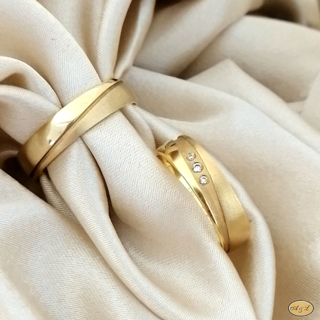 Sonstiges: Leicht gerundete Eheringe. Es gibt einen sandgestrahlten Kanal am Weibchen. Eine Seite ist leicht matt, während die andere Seite hell poliert ist.