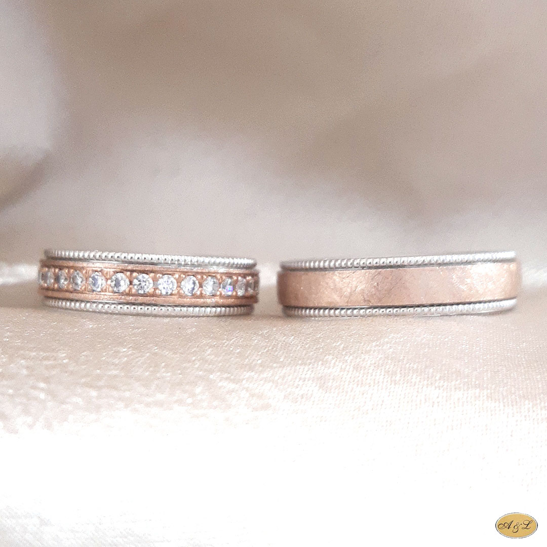 Sonstiges: Flach, matt mit eismatter Technik, innen leicht gerundet. Zirkone auf dem ganzen Ring verpackt. Ringkantenstücke aus Weißgold und handgeschnitzten Kanälen in filigraner Technik.