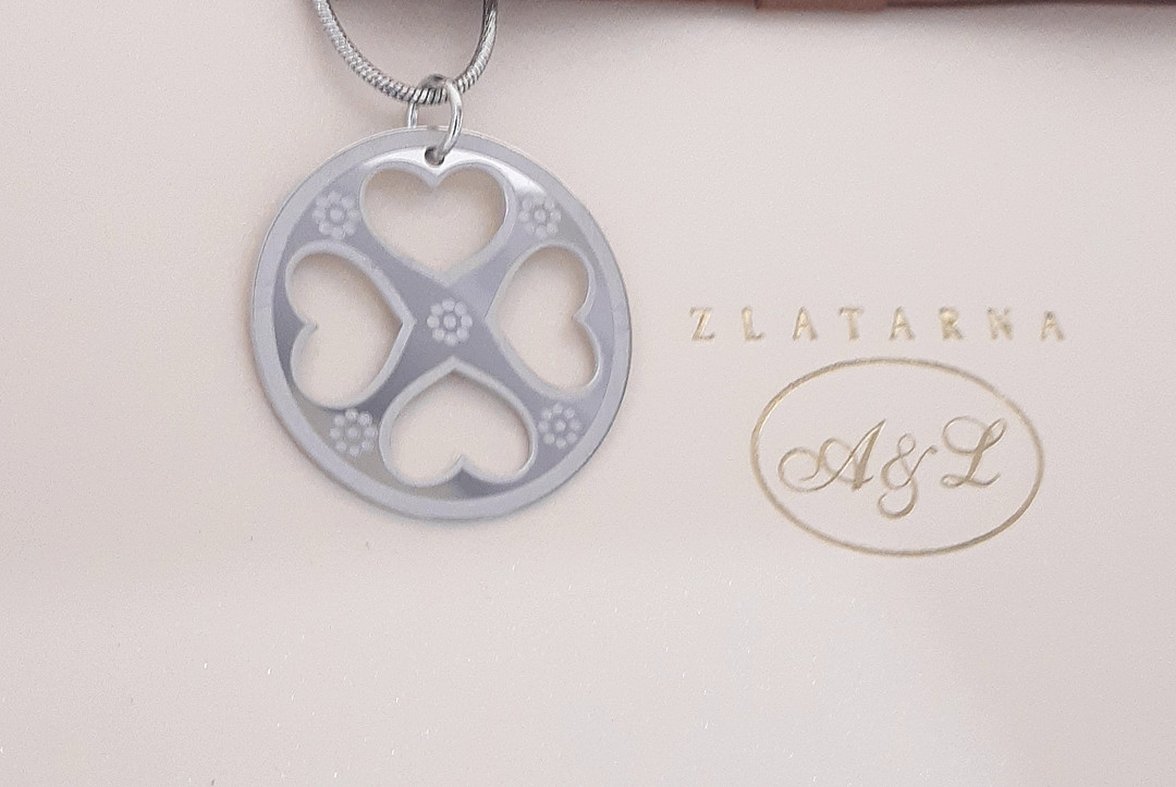 Ostalo: Aplicirana dvostruka zaštita od oksidacije (rodij). Prekrasan privjesak, okruglog oblika promjera 3 cm, sa četiri srca i matiranim cvijetićima.