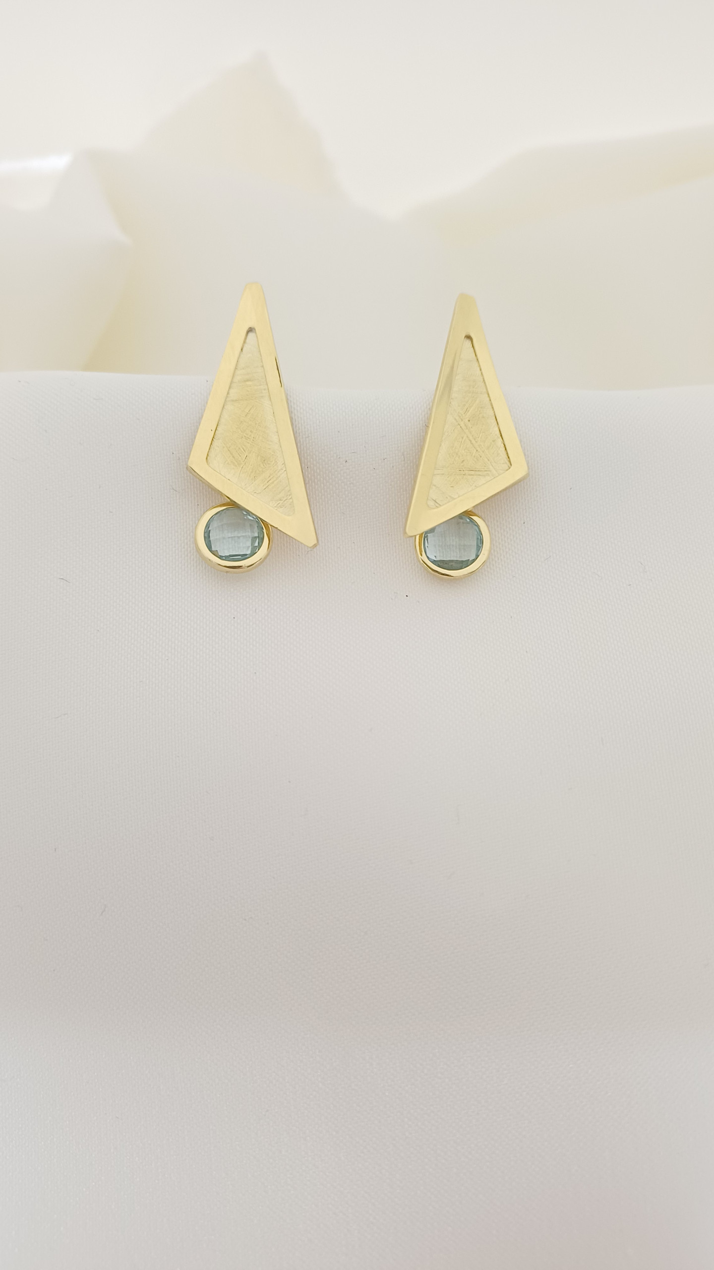 Ostalo: Trokutastog oblika sa sjajnim rubovima i matiranom sredinom, te visećim cirkonima svijetloplave boje na štift. Duljine 3 cm. Aplicirana dvostruka zaštita od oksidacije (žuti rodij). .