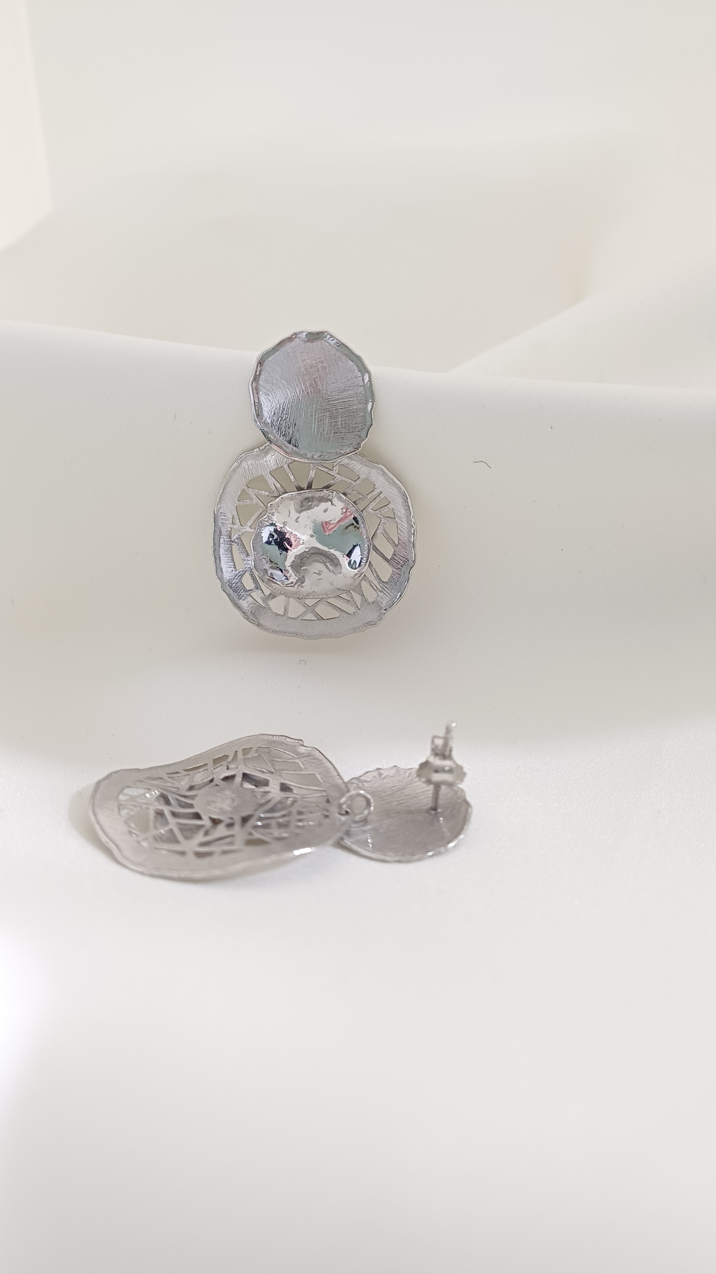 Ostalo: Aplicirana dvostruka zaštita od oksidacije (rodij). Zanimljivog dizajna, duljine 4 cm,promjer donjeg kruga 3 cm . Na štift kopčanje. Ručni rad.