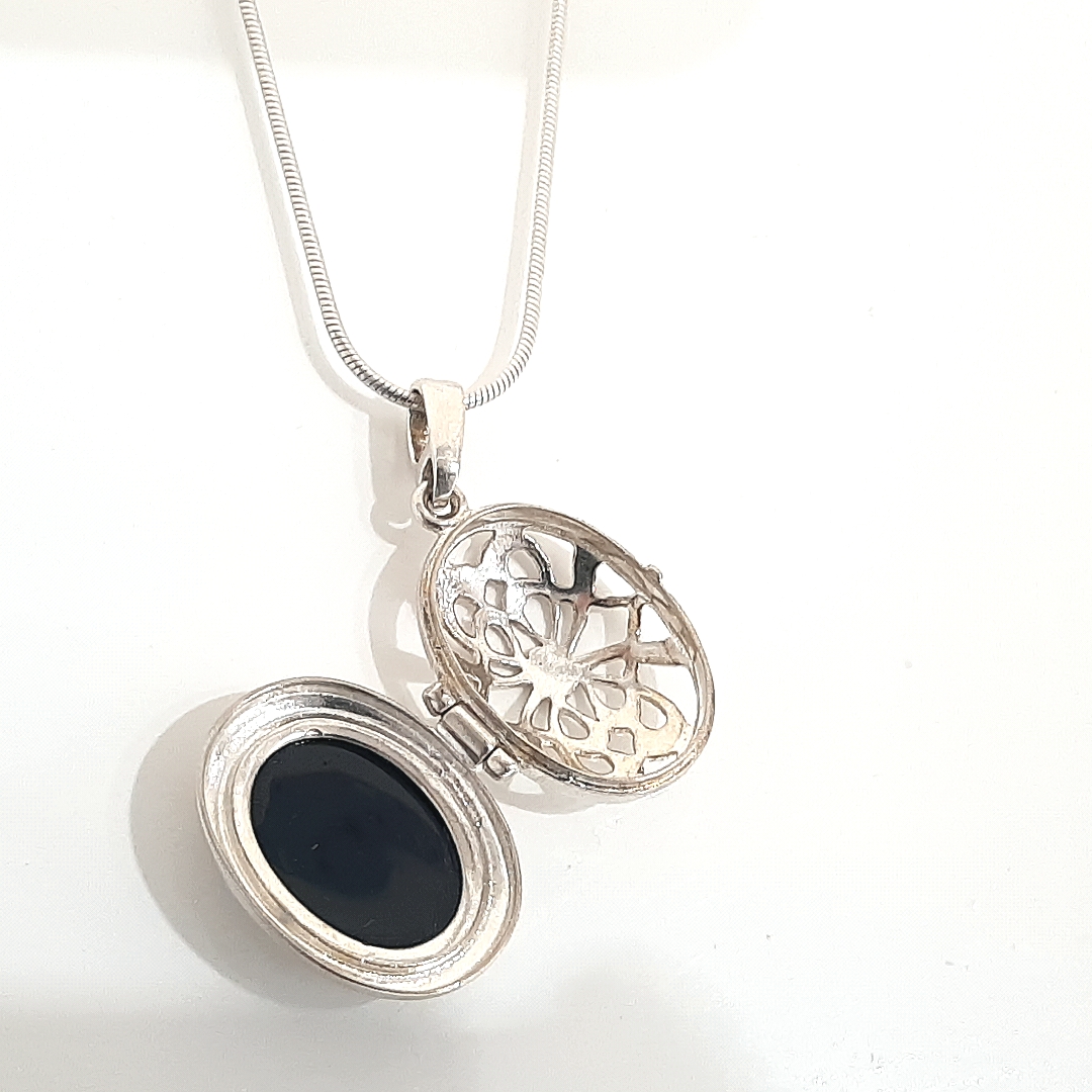 Ostalo: Aplicirana dvostruka zaštita od oksidacije (rodij). Ovalni jantar, zelenkaste boje, ufasiran kao medaljon. Duljine 2,5 cm.