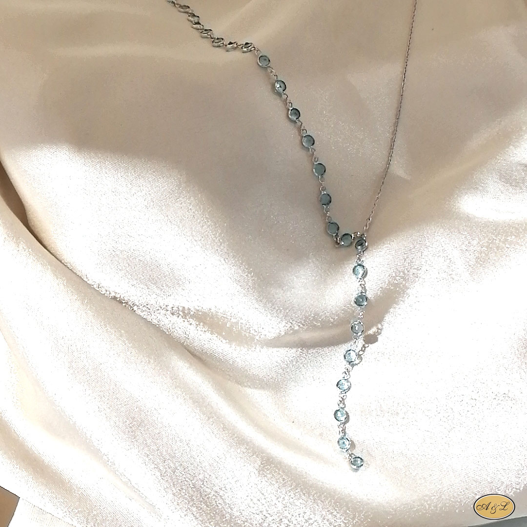 Ostalo: Aplicirana dvostruka zaštita od oksidacije (rodij). Na jednoj strani po cijeloj dužini ogrlice nalaze se cirkoni u svijetlo plavoj boji promjera 3mm. Duljina donjeg dijela 7cm. Ukupna duljina ogrlice sa produžetkom 60cm