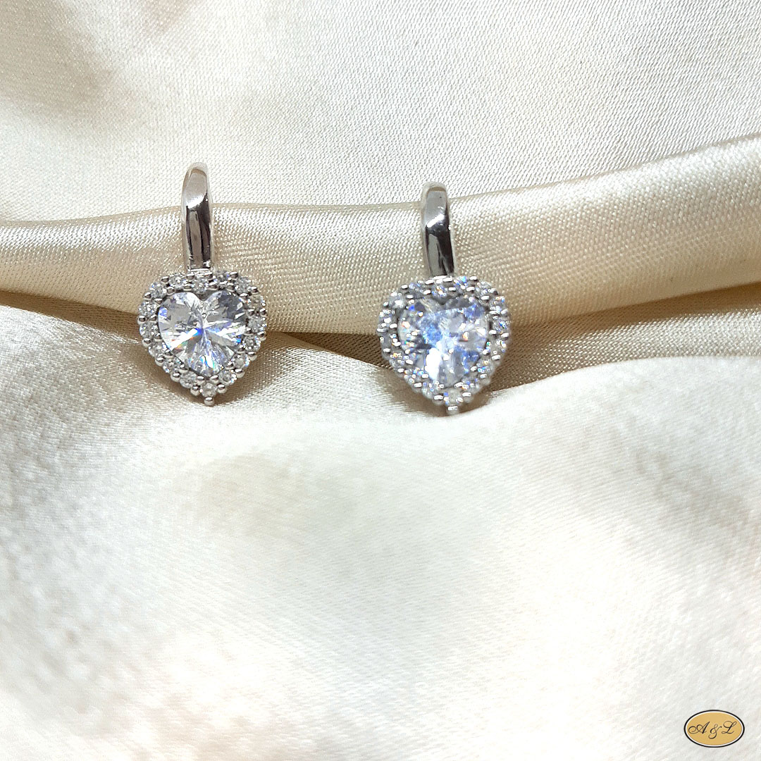 Sonstiges: Angewandter doppelter Schutz gegen Oxidation (Rhodium) Silberohrringe mit klassischem Verschluss. Herzförmig mit umgebenden Zirkonen und einem zentralen Zirkon mit einer Größe von 6,20 mm.
